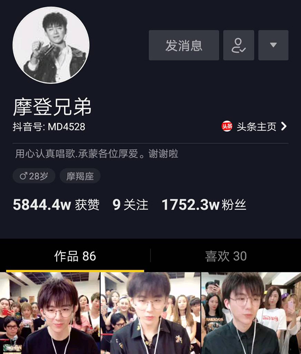 近日摩登兄弟持续包揽公众的视野,席卷了抖音、微博热搜,以及各大音乐平台。抖音上摩登兄弟的粉丝已经突破1752万,据说最快的时候一周内涨粉700万,平均一天涨粉100万的节奏。