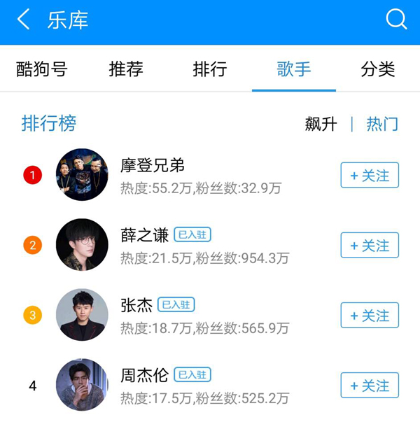 不仅如此,摩登兄弟以超过55万的热度值稳稳地占据酷狗音乐歌手榜首位,而这一热度值竟然和排在第二第三第四名的薛之谦、张杰、周杰伦等知名歌手的热度值总和持平,此外在QQ音乐的热门搜索中,摩登兄弟的相关推荐也是屡见不鲜。网友表示,这哪是摩登兄弟,这简直是神仙兄弟。