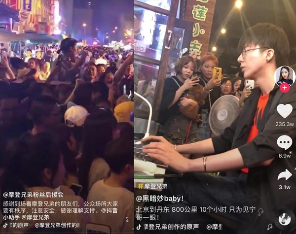 每天的晚上六点半,丹东老街就会热闹起来。如今,为了一睹摩登兄弟的风采,到场的粉丝通常下午三点就会提前排队,当直播开播的时候,直播间外的丹东老街已经被人群层层包裹。