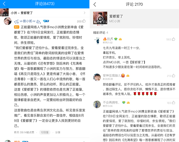《爱都爱了》是小洲近期重磅推出的一首原创词曲的正能量爱情歌曲,风格大气激扬。“我们爱都爱了,还怕什么”,小洲用一句简单的歌词,完美地诠释了对爱情的勇气和对未来生活的向往。由于歌曲动人,有网友调侃:“唱爱情歌曲的小洲,唱出了大家欠他一个媳妇儿的味道”。同时,各大音乐平台,也可以看到很多粉丝的留言,大家纷纷用语言表达对这首歌曲的喜爱。