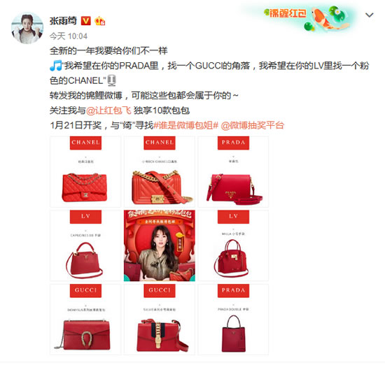 张雨绮身打出“全网寻找微博包姐”的口号,热情四溢地送出10款大牌包包,并且是大吉大利的中国红颜色,可以说是名副其实的“满屏红”了。